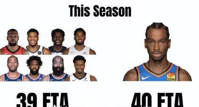 美国媒体又晒出了一个新的数据,本赛季到目前为止,杜兰特字母哥这两位超级巨星领衔,再加上罚球大王恩比德和七届罚球王哈登,以及贾伦杰克逊、莱昂纳德、爱德华兹和米切尔这8位超级巨星,一共得到了39次罚球,亚历山大一共得到了40次罚球。1个人的罚球比8位超巨都多,难道亚历山大1>8,真有这种实力了?